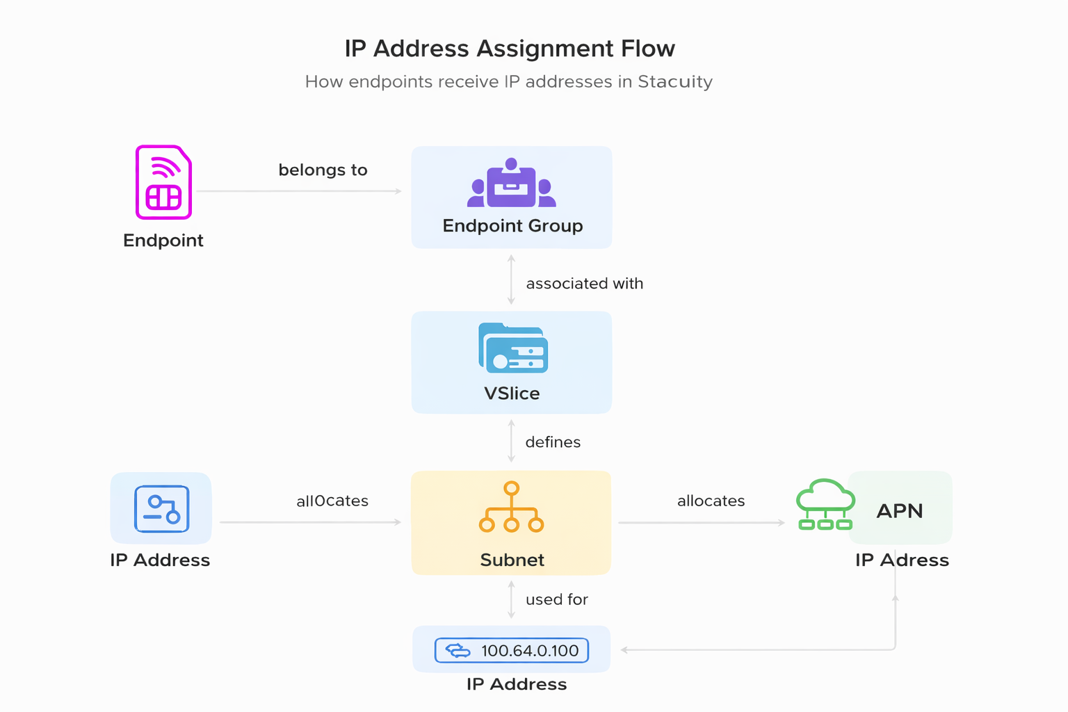 - When the endpoint establishes a data session, an IP address is assigned from the relevant subnet