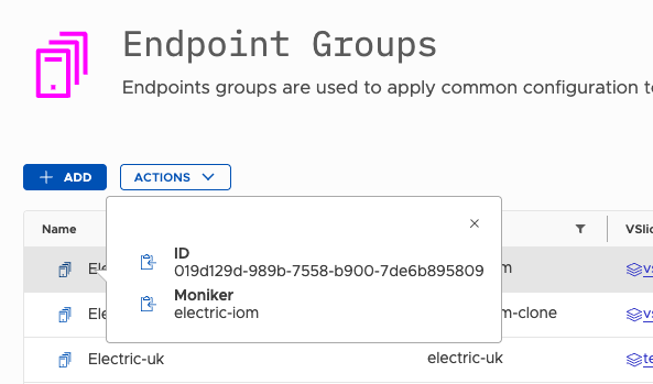 You can view teh ID and Moniker of an endpoint group by clicking the signpost icon.