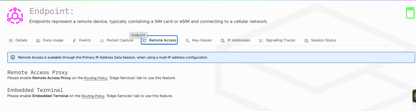Remote Access is configured using Edge Services and applied via the Endpoint Group. Once Remote Access features are enabled on the Routing Policy (Edge Services tab), the Remote Access tab displays active connection options for the endpoint.
