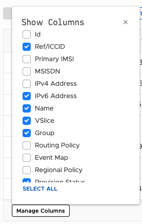 Click Manage Columns at the bottom left of any list to choose which columns are visible. Check or uncheck columns to show or hide them. This is particularly useful for troubleshooting—for example, showing the Routing Policy or Regional Policy column lets you quickly spot if an endpoint has an unexpected configuration without opening each record individually.