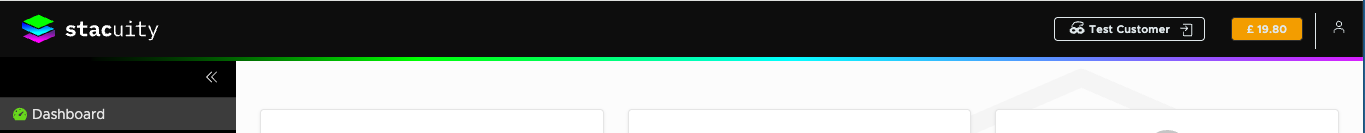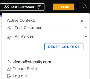 Tenant Portal switches you to the Stacuity Tenant Portal if your organisation has access to it. This is a separate interface used for managing customers, tariffs, and sub-tenants.