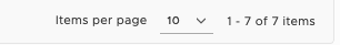 The bottom of every list shows the total number of items and the current page. Use the Items per page dropdown to control how many records are shown at once. The counter (for example, "1 - 7 of 7 items") confirms how many records match your current filters.