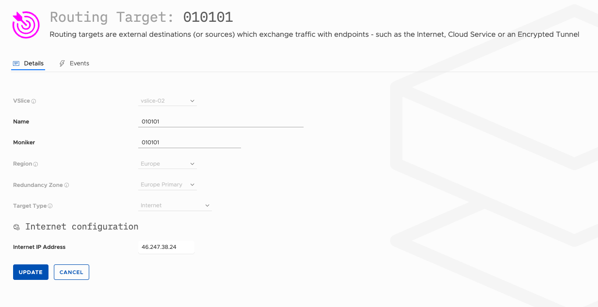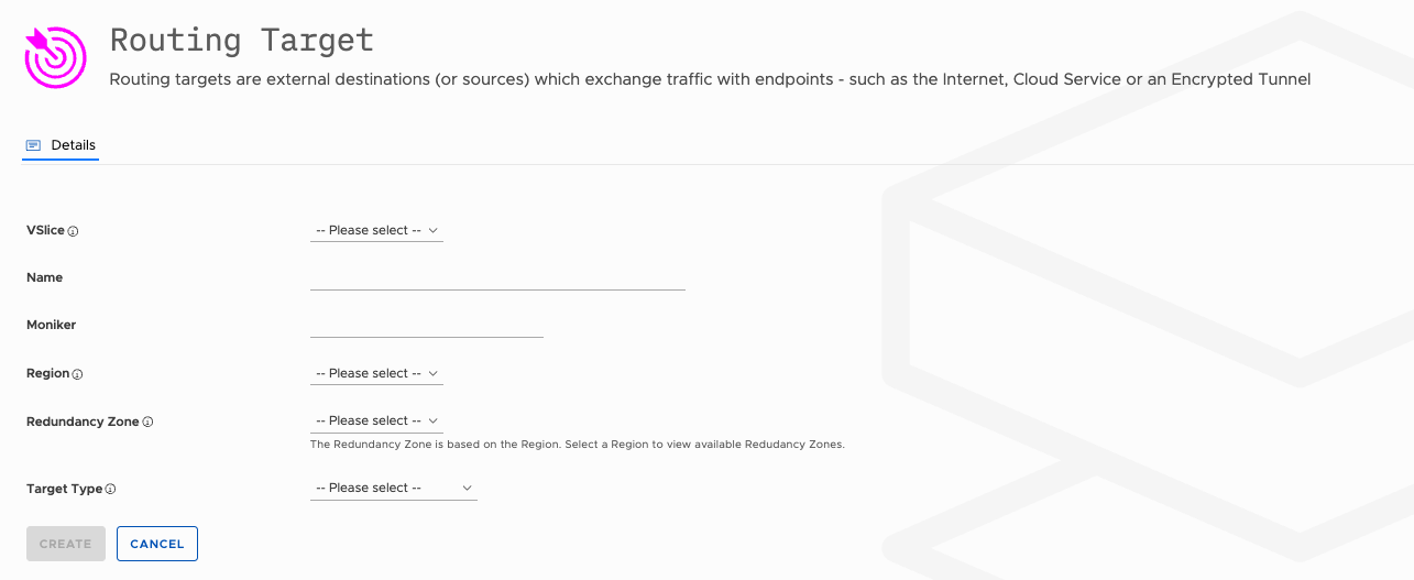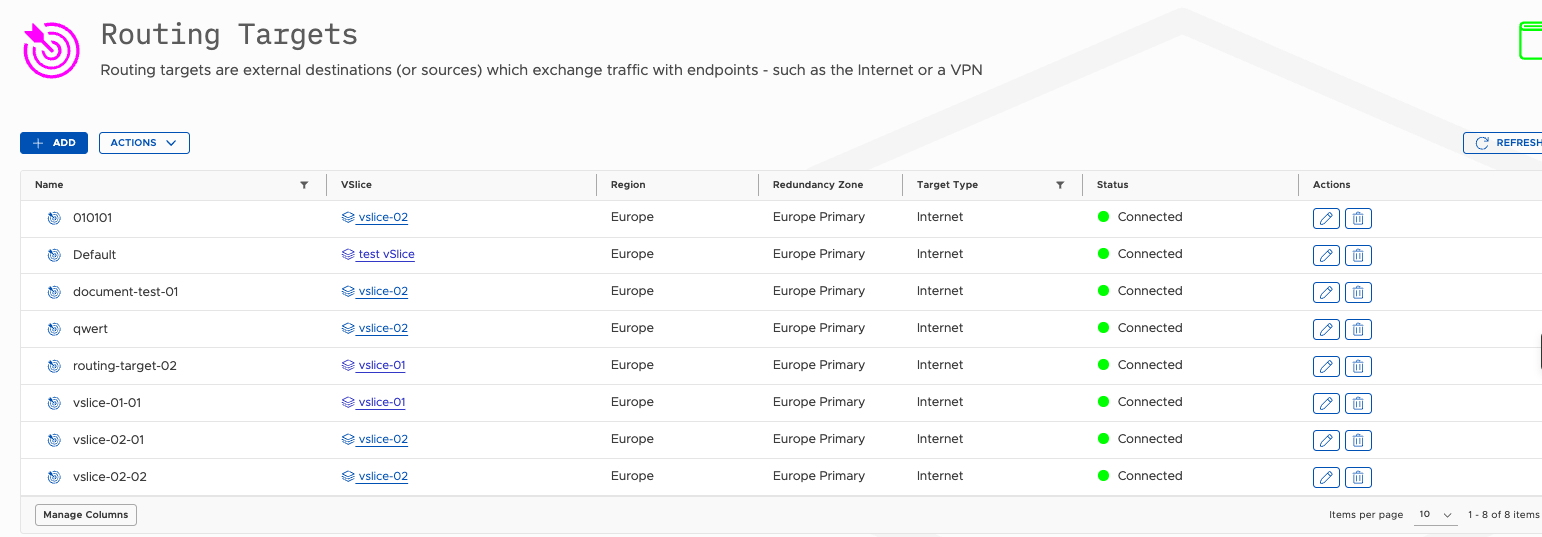 Routing Targets belong to a VSlice. Every Routing Target, Routing Policy, and Endpoint Group used together must belong to the same VSlice.