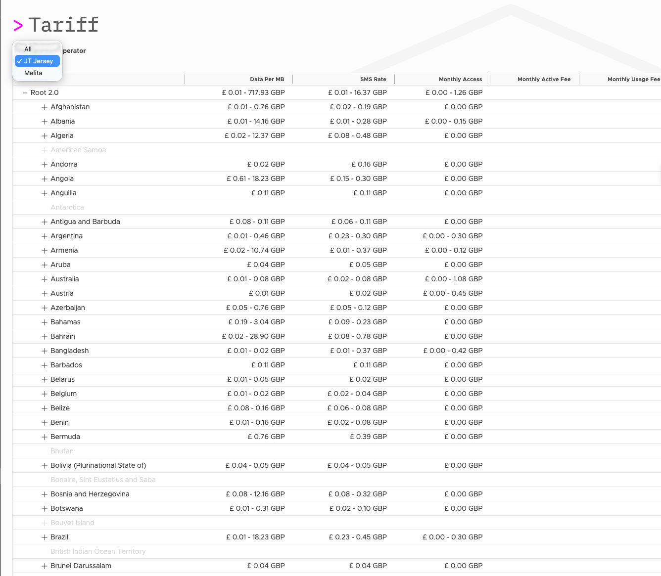 The Tariff section provides a detailed view of the rates applied to your connectivity usage across different countries and operators.