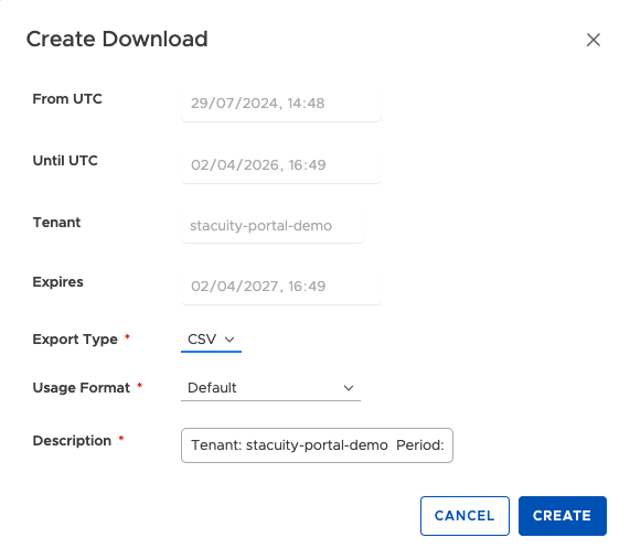 To export usage records, click Create Download. This opens a modal dialog with the following fields: