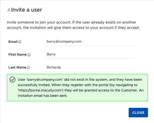 The user receives an email with an invitation. When they navigate to https://portal.stacuity.com and register, they are granted access to your account.