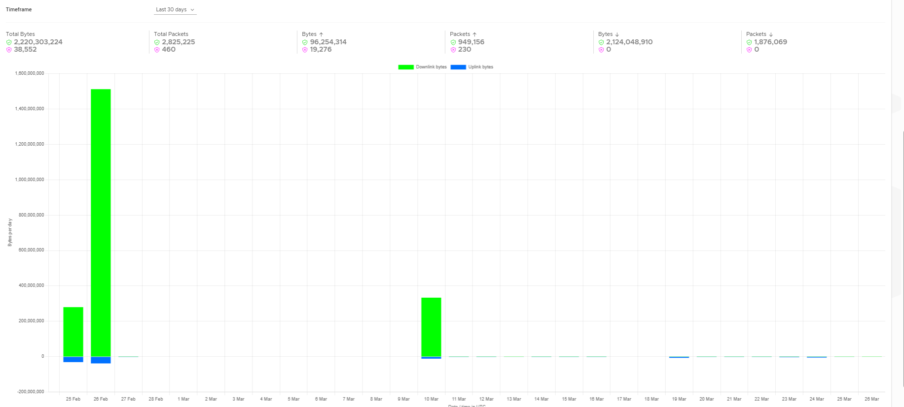 Each metric displays two values. The bar chart plots bytes per day, with downlink bytes shown in green and uplink bytes in blue. Use the Timeframe dropdown to adjust the reporting window - options include Last 7 days and Last 30 days.