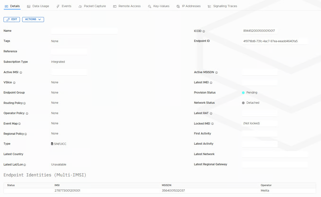 Some endpoints may display multiple IMSIs. This occurs when the endpoint is configured for multi-IMSI roaming. IMSI selection is handled by external orchestration systems. The primary IMSI is displayed first, followed by any secondary IMSIs.
